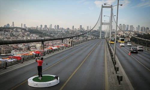 Tiger Woods hits a ball on Tuesday during an event to promote the upcoming Turkish Airlines Open golf tournament on the Bosphorus Bridge, which links the city’s European and Asian sides, in Istanbul. Photo: IC