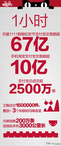 The photo, published by Tmall on November 11, 2013 shows that the e-shopping platform has received 6.7 billion yuan in sales during the first hour of the Double 11 shopping day, which coincides with China's Singles' Day. Photo: Sina Weibo