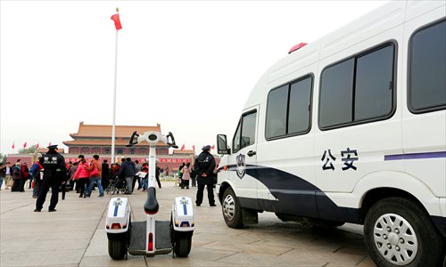 A police vehicle parks in front of Tiananmen Square in Beijing on Saturday. Public security departments have stepped up security checks around Tiananmen Square as the four-day Third Plenary Session of the 18th Communist Party of China Central Committee started on Saturday. Photo: IC