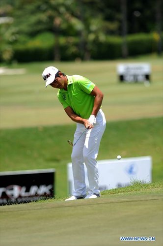 Chinese Golfer Liang Wenchong hits the ball during the final day of Enjoy Jakarta Indonesia PGA Championship at Emeralda Golf Club in Jakarta, Indonesia, March 31, 2013. Liang Wenchong got the score 15 under par in the 7th posisition. (Xinhua/Veri Sanovri)