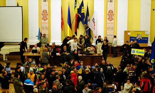 Supporters of European integration rest on Monday in Kiev’s city hall, which they occupied during a protest against the government’s decision to delay signing a trade deal with the EU. Photo: CFP
