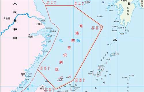 The Ministry of National Defense of the People's Republic of China issued a statement on establishing the East China Sea Air Defense Identification Zone. The zone includes the airspace within the area enclosed by China's outer limit of the territorial sea and the following six points: 33º11'N (North Latitude) and 121º47'E (East Longitude), 33º11'N and 125º00'E, 31º00'N and 128º20'E, 25º38'N and 125º00'E, 24º45'N and 123º00'E, 26º44'N and 120º58'E. Photo: www.mod.gov.cn
