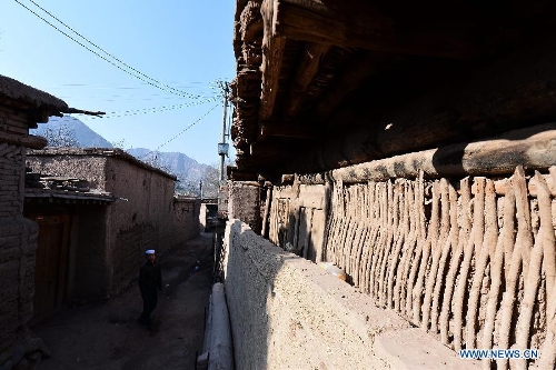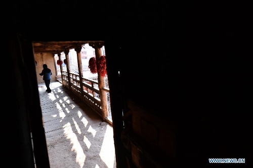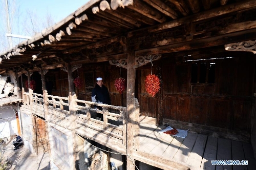 A villager walks on the second floor of his wooden fence dwelling in Dazhuang Village of Salar Autonomous County of Xunhua, northwest China's Qinghai Province, Dec. 13, 2013. Dated from the Ming (1368-1644) ang Qing (1644-1911) dynasties, wooden fence dwellings have played an important role in Salar people's daily life. Salar people's wooden fence dwellings, named after the vine-knitted walls, are of great value in the study of Salar people's economy, culture and history. (Xinhua/Wu Gang)