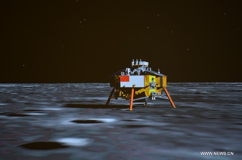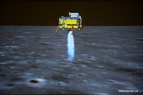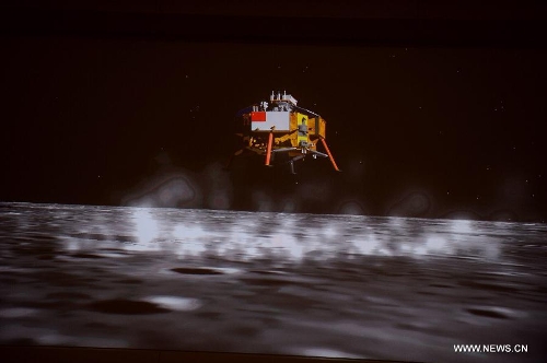 Photo taken on Dec. 14, 2013 shows the lunar probe Chang'e-3 on the screen of the Beijing Aerospace Control Center in Beijing, capital of China. China's lunar probe Chang'e-3, with the country's first moon rover onboard, landed on the moon on Saturday night, marking the first time that China has sent a spacecraft to soft land on the surface of an extraterrestrial body. (Xinhua/Jin Liangkuai)