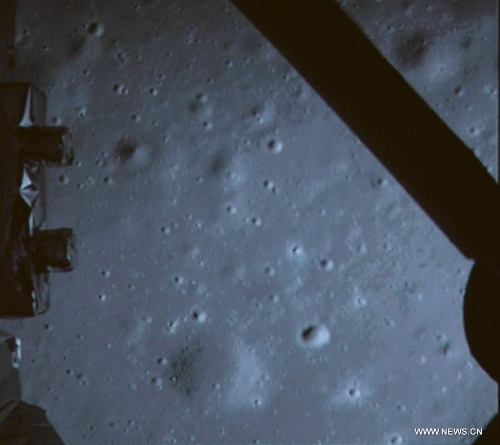 Photo taken on Dec. 14, 2013 shows a picture of the moon surface taken by the on-board camera of lunar probe Chang'e-3 on the screen of the Beijing Aerospace Control Center in Beijing, capital of China. China's lunar probe Chang'e-3, with the country's first moon rover onboard, landed on the moon on Saturday night, marking the first time that China has sent a spacecraft to soft land on the surface of an extraterrestrial body. (Xinhua/Li Xin)