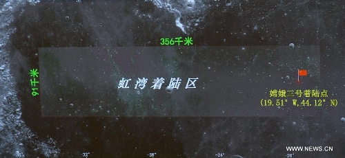 Photo taken on Dec. 14, 2013 shows the landing spot of lunar probe Chang'e-3 indicated on the screen of the Beijing Aerospace Control Center in Beijing, capital of China. China's lunar probe Chang'e-3, with the country's first moon rover onboard, landed on the moon on Saturday night, marking the first time that China has sent a spacecraft to soft land on the surface of an extraterrestrial body. (Xinhua/Li Xin)
