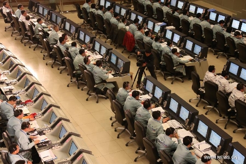 Staff members monitor the landing process of lunar probe Chang'e-3 at the Beijing Aerospace Control Center in Beijing, capital of China, Dec. 14, 2013. China's lunar probe Chang'e-3, with the country's first moon rover onboard, landed on the moon on Saturday night, marking the first time that China has sent a spacecraft to soft land on the surface of an extraterrestrial body. (Xinhua/Wang Jianmin)