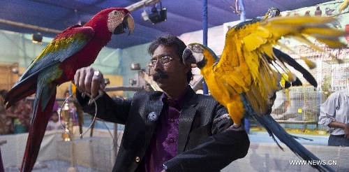 An Indian bird lover exhibits his Macaw birds during a bird show in Calcutta, capital of eastern Indian state West Bengal, Dec. 25, 2013. (Xinhua/Tumpa Mondal)