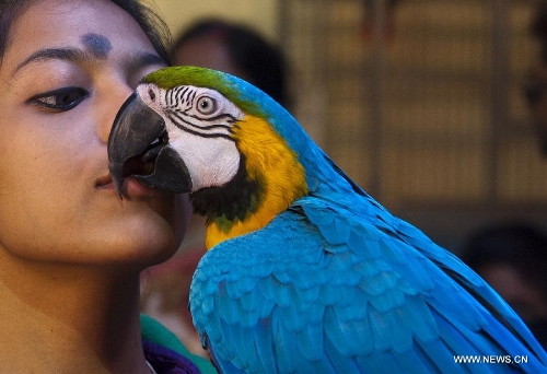 An Indian bird lover kisses her Macaw during a bird show in Calcutta, capital of eastern Indian state West Bengal, Dec. 25, 2013. (Xinhua/Tumpa Mondal)