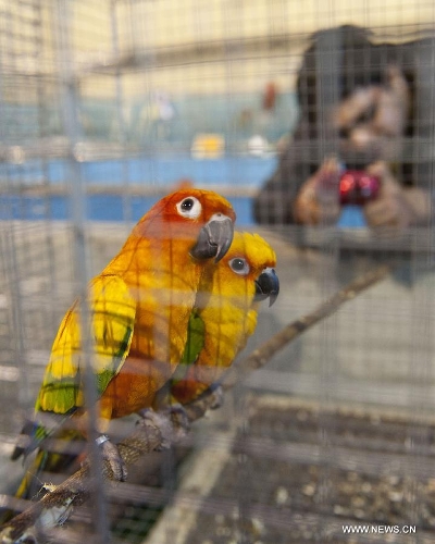 A pair of South American Sun Conures are seen during a bird show in Calcutta, capital of eastern Indian state West Bengal, Dec. 25, 2013. (Xinhua/Tumpa Mondal)
