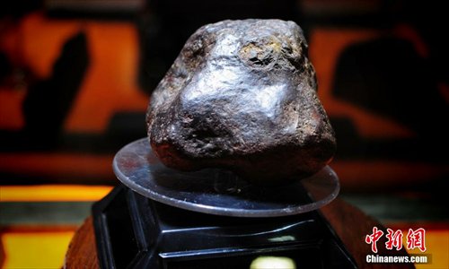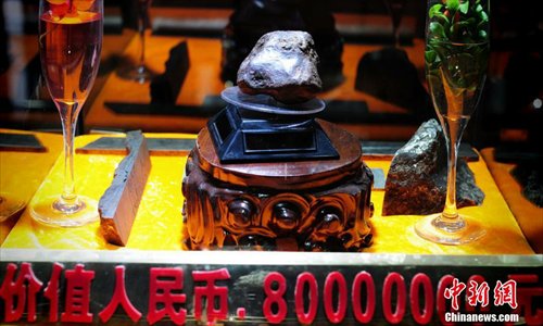 A small meteorite is displayed with an 80 million yuan price tag ($13.2 million) at a dealer's shop in Urumqi, Xinjiang Uyghur Autonomous Region on December 25. Farmers dug up the asteroid remnant, measuring about 8 centimeters across and weighing nearly half a kilogram, after it fell in Xinjiang's Qitai county on April 12, 2009. Photo: chinanews.com
