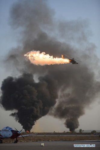 An Apache helicopter gunship releases decoy flares during an air show highlighting the Israeli Air Force's 167th class pilot graduation at the Hatzerim Air Base in Be'er Sheva, southern Israel, on Dec. 26, 2013. The Israeli Air Force welcomed into its ranks a new batch of pilots, with the country's political and military leaderships on hand to congratulate here on Thursday. (Xinhua/IDF/Judah Ari Gross)