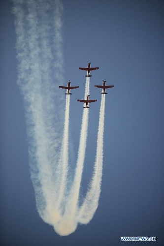 Four Beechcraft T-6 Texan IIs of the Israeli Air Force's aerobatic flight demonstration team execute a formation loop during the Israeli Air Force's 167th class pilot graduation at the Hatzerim Air Base in Be'er Sheva, southern Israel, on Dec. 26, 2013. The Israeli Air Force welcomed into its ranks a new batch of pilots, with the country's political and military leaderships on hand to congratulate here on Thursday. (Xinhua/IDF/Judah Ari Gross)