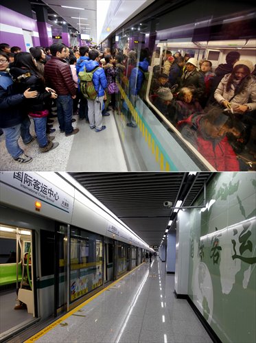 Metro lines 16 (above) and 12 open Sunday to waiting passengers. The passenger volume of Line 16 was 36 percent higher than Line 12 as of 1 pm. The opening of the lines gave Shanghai the most extensive subway system in the world. Photo: Yang Hui/GT