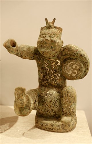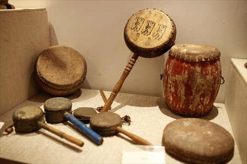 Quan owns roughly 80 drums, some of which date back to the Shang Dynasty (C.1600-1046BC). Exhibits on view at the exhibition include traditional red drums with painted auspicious cloud and qilin images, ancient pottery figures of a man playing a drum, as well as a selection of rattles from the Republican era (1912-49).