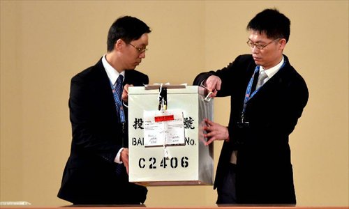 Two staff members move a ballot box to the central ballot-counting hall during the chief executive election of Hong Kong Special Administrative Region (SAR) in Hong Kong, South China, March 25, 2012. The 2012 chief executive election of Hong Kong SAR was held on March 23. Leung Chun-ying, former convenor of the Non-Official Members of the Executive Council of Hong Kong, won the election. (Xinhua/Chen Xiaowei)