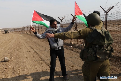 A Palestinian protester holds national flags in front of a Israeli soldier during a protest near the Dead Sea on the edge of the West Bank city of Jericho on Jan. 1, 2014. Israel's Ministerial Committee for Legislation passed Sunday a bill to annex Jewish settlements in the Palestinian Jordan Valley to be an official part of the Jewish state. (Xinhua/Luay Sababa)