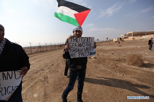 A Palestinian protester holds a banner during a protest near the Dead Sea on the edge of the West Bank city of Jericho on Jan. 1, 2014. Israel's Ministerial Committee for Legislation passed Sunday a bill to annex Jewish settlements in the Palestinian Jordan Valley to be an official part of the Jewish state. (Xinhua/Luay Sababa)