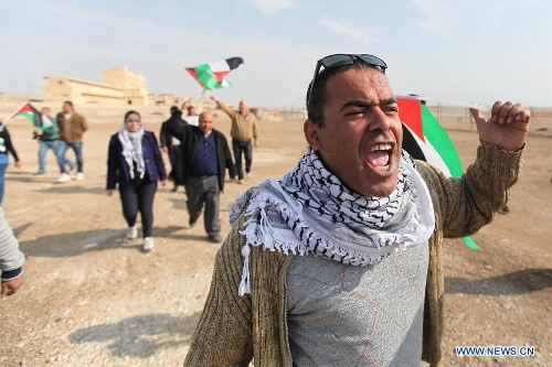 A Palestinian protester shouts slogans during a protest near the Dead Sea on the edge of the West Bank city of Jericho on Jan. 1, 2014. Israel's Ministerial Committee for Legislation passed Sunday a bill to annex Jewish settlements in the Palestinian Jordan Valley to be an official part of the Jewish state. (Xinhua/Luay Sababa)