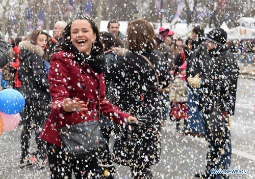 A woman revels in a confetti rain during a New Year parade on the Champs-Elysees in Paris, Jan. 1, 2014. Some 600 performers from over 10 French circuses took part in the parade on the famous avenue on Wednesday afternoon. (Xinhua/Li Genxing)