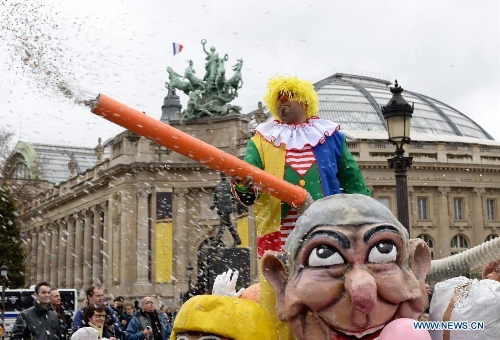 A clown throws confetti during a New Year parade on the Champs-Elysees in Paris, Jan. 1, 2014. Some 600 performers from over 10 French circuses took part in the parade on the famous avenue on Wednesday afternoon. (Xinhua/Li Genxing)