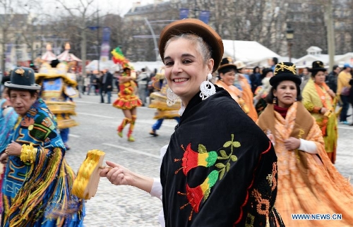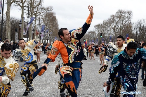 Dancers perform during a New Year parade on the Champs-Elysees in Paris, Jan. 1, 2014. Some 600 performers from over 10 French circuses took part in the parade on the famous avenue on Wednesday afternoon. (Xinhua/Li Genxing)