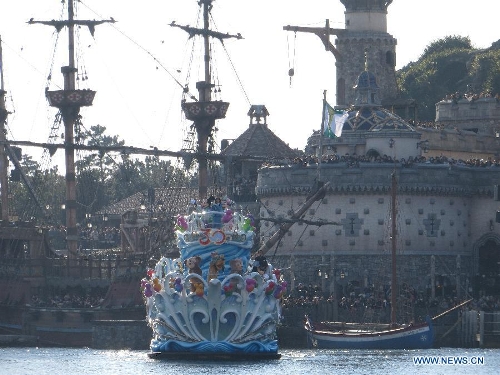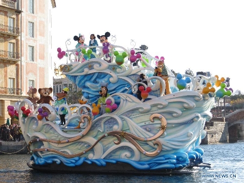 Disney characters wave to greet guests during the theme park's New Year's Day cruise at Tokyo DisneySea in Urayasu, just outside Tokyo, Japan, Jan. 1, 2014. (Xinhua/Yang Ting)