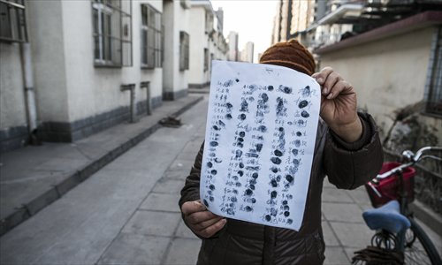 Liu Donglu holds up a petition signed by Shuihou villagers trying to get back money they lost to the factory shutdown. Photo: Li Hao/GT