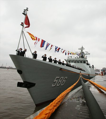Officers onboard light missile frigate Ji'an salute during a ceremony on Wednesday in Shanghai as it is commissioned for the East China Sea fleet of the People's Liberation Army navy. Photo: CFP