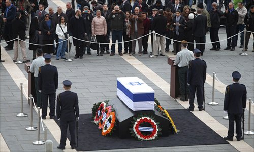 People take pictures as they walk past the coffin of former Israeli prime minister Ariel Sharon during a national memorial ceremony at the Knesset in Jerusalem on Sunday. Photo: CFP