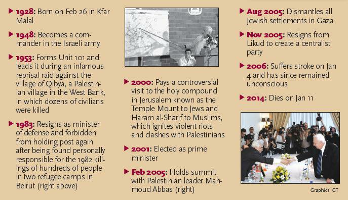 "Bulldozer in war and peace," said the English-language Jerusalem Post, describing him as "perhaps the most revered and often reviled of the country's politicians, perceived alternately as a peacemaker and a warmonger."