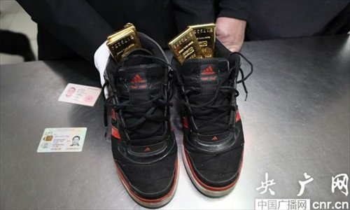 A Hong Kong man was caught attempting to smuggle four kilograms of gold bars into the Chinese mainland stuffed in his shoes on January 6.
