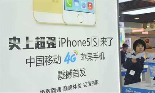 A saleswoman stands next to a poster for 4G-supported iPhone 5s smartphones at a China Mobile store in Hangzhou, East China's Zhejiang Province, December 18, 2013. Photo: IC