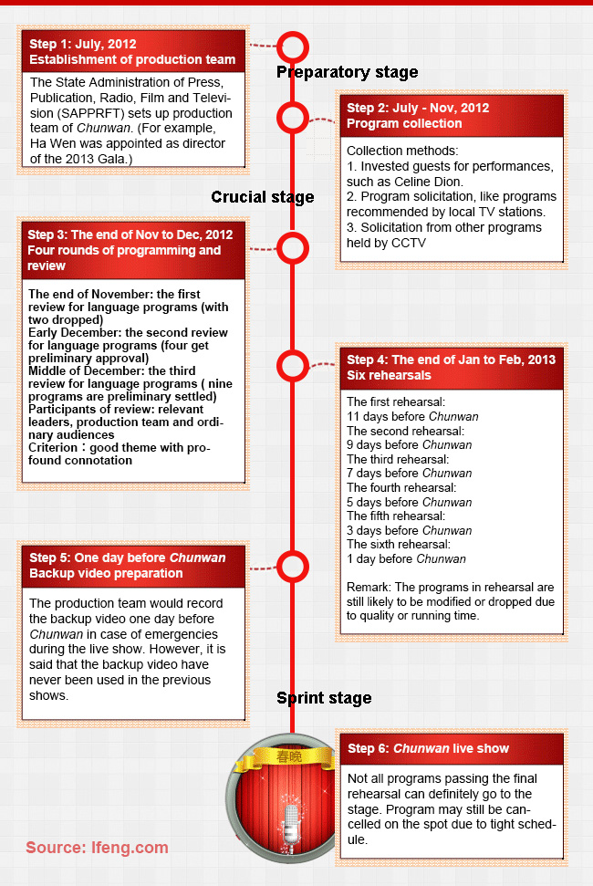 Chunwan, or CCTV's Spring Festival Gala, is an unavoidable topic once it comes to the midpoint of a year. This topic is even hotter than any years before. The State Administration of Press Publication, Radio, Film and Television issued a notice to its counterpart organs at the level of provinces, municipalities and autonomous regions on July 1, claiming that the CCTV Gala for the Spring Festival 2014 will be changed in terms of the mechanism in producing it, including the competitive selection of the directing team and the programs. It will be a transparent progress in making the gala, CCTV reportecd.