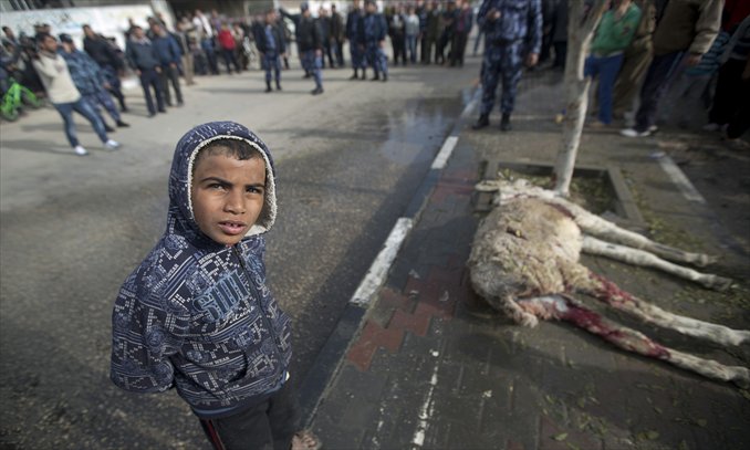 A Palestinian boy stands next to a donkey killed in an Israeli air strike in Gaza City on Sunday. Two Palestinians were hurt, one critically, in an Israeli air strike on Gaza City, which the military said had targeted a senior Islamic Jihad militant. Photo: AFP