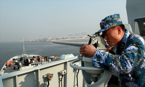 A member of the Chinese navy conducts observations from amphibious landing craft Changbaishan on Monday. A flotilla with China's South China Sea fleet on Monday set sail from a military port in Hainan Province for a drill in the South China Sea. Photo: Xinhua