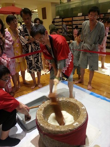 Activities celebrating traditional Japanese events are held regularly for customers to participate in. On the first day of the coming lunar new year, for instance, customers can make mochi, sticky rice cakes traditionally eaten for the holiday, by pounding them with a large wooden hammer.
