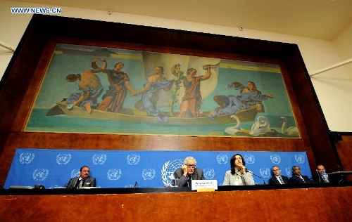 United Nations mediator Lakhdar Brahimi (2nd L) attends a press conference in Geneva, Jan. 24, 2014. Talks for a solution to end conflicts in Syria will continue this weekend, and neither the government delegation nor the opposition is going to withdraw, confirmed the UN mediator here on Friday evening.(Xinhua/Qian Yi)