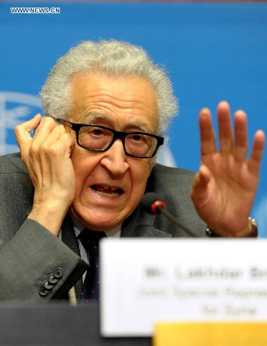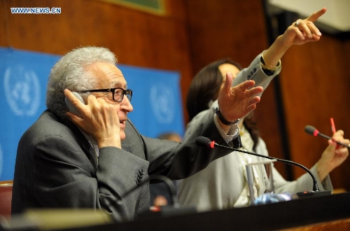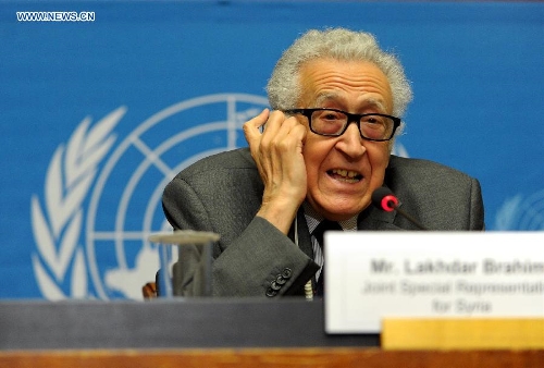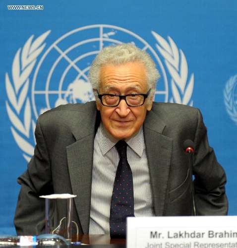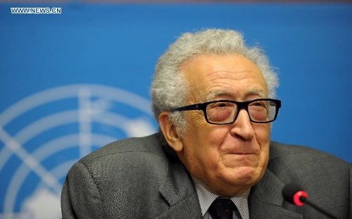 United Nations mediator Lakhdar Brahimi attends a press conference in Geneva, Jan. 24, 2014. Talks for a solution to end conflicts in Syria will continue this weekend, and neither the government delegation nor the opposition is going to withdraw, confirmed the UN mediator here on Friday evening.(Xinhua/Qian Yi)