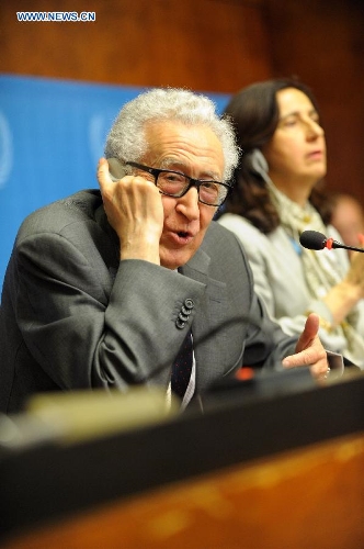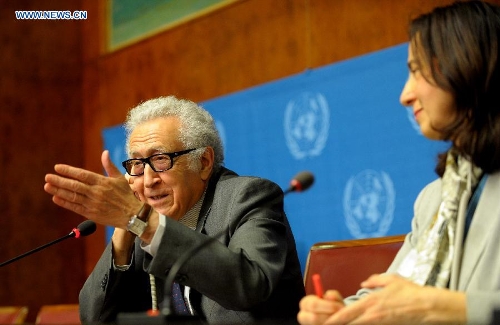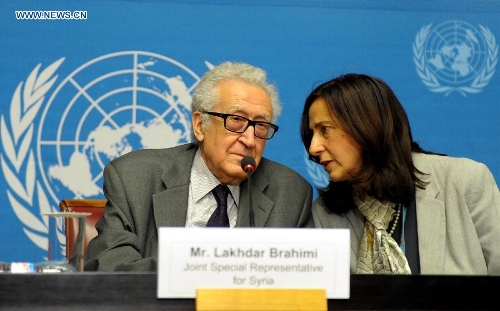 United Nations mediator Lakhdar Brahimi (L) attends a press conference in Geneva, Jan. 24, 2014. Talks for a solution to end conflicts in Syria will continue this weekend, and neither the government delegation nor the opposition is going to withdraw, confirmed the UN mediator here on Friday evening.(Xinhua/Qian Yi)