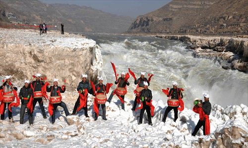 Folk culture actors perform in a drum competition at the Hukou Fall scenic spot of the Yellow River on Saturday. On the same day, the area was reopened to tourists after being hit by ice floods. Photo: Xinhua