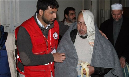A Red Crescent staff member (L) aids a civilian to get on a bus evacuating civilians out of the besieged old city of Homs, central Syria, Feb. 7, 2014. More than a dozen civilians were evacuated Friday from the rebel-held old Homs city, as part of an agreement concluded recently between the Syrian government and the UN to evacuate hundreds of trapped people there. Photo:Xinhua