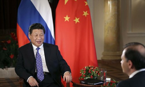 Visiting Chinese President Xi Jinping (L) gives an interview to a Russian TV channel in Sochi, Russia, February 7, 2014. Photo: Xinhua