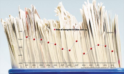 Since 2001, the average price of newsprint in China has fluctuated from 3,950 to 6,300 yuan per ton, Yan Hainan, an analyst from Shenzhen-based industrial research website askci.com, told the Global Times on Monday. The current price is close to bottom, he believed.