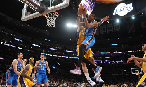 Kevin Durant of the Oklahoma City Thunder goes for a layup against Robert Sacre of the Los Angeles Lakers at Staples Center on Thursday in Los Angeles. Photo: CFP