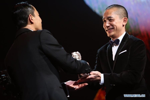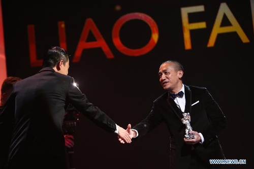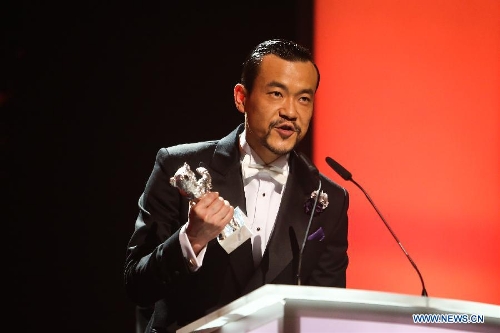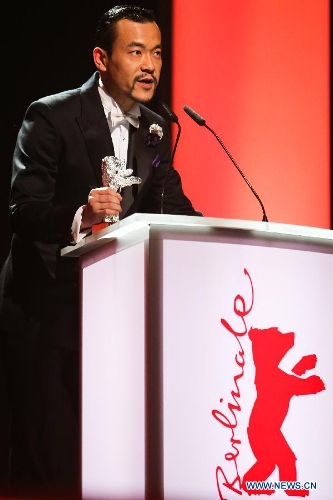 Actor Liao Fan receives the Silver Bear for Best Actor for Black Coal, Thin Ice during the awards ceremony at the 64th Berlinale International Film Festival in Berlin, Feb. 15, 2014. (Xinhua/Zhang Fan)