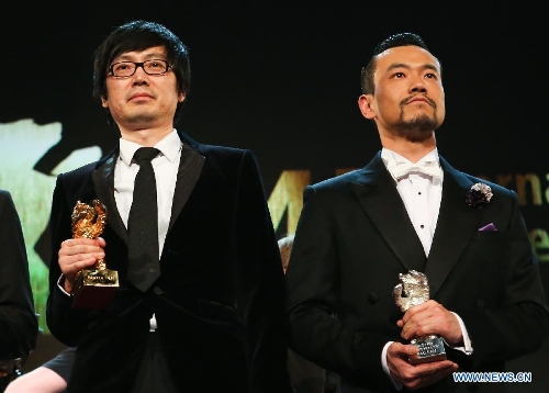 Director Diao Yinan (L) of Black Coal, Thin Ice , winner of the Golden Bear for the Best Film, and Liao Fan, winner of the Silver Bear for Best Actor for "Black Coal, Thin Ice", pose for photos during the awards ceremony at the 64th Berlinale International Film Festival in Berlin, Feb. 15, 2014. (Xinhua/Zhang Fan)