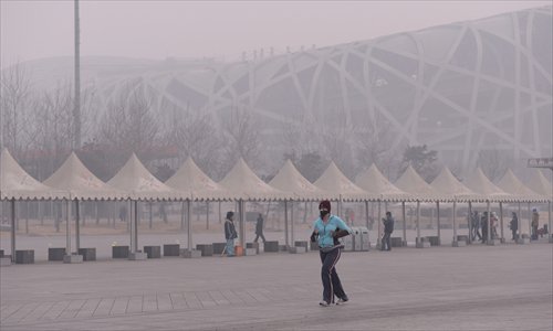 A woman wearing a mask jogs beside the Olympic Park in Beijing during smoggy weather on Saturday. Photo: CFP