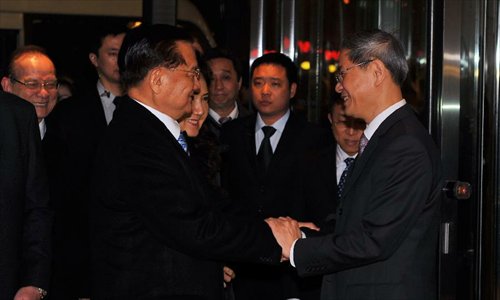 Zhang Zhijun (R), head of the State Council Taiwan Affairs Office, welcomes a delegation led by Kuomintang Honorary Chairman Lien Chan (L), also chairman of a foundation on cross-Strait peaceful development, at their hotel in Beijing, China, Feb. 17, 2014. Photo: Xinhua