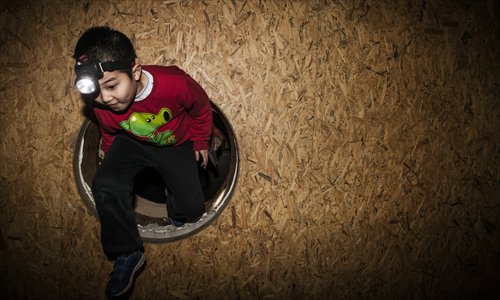A boy steps through a passageway while playing the ancient tomb game. Photo: Li Hao/GT